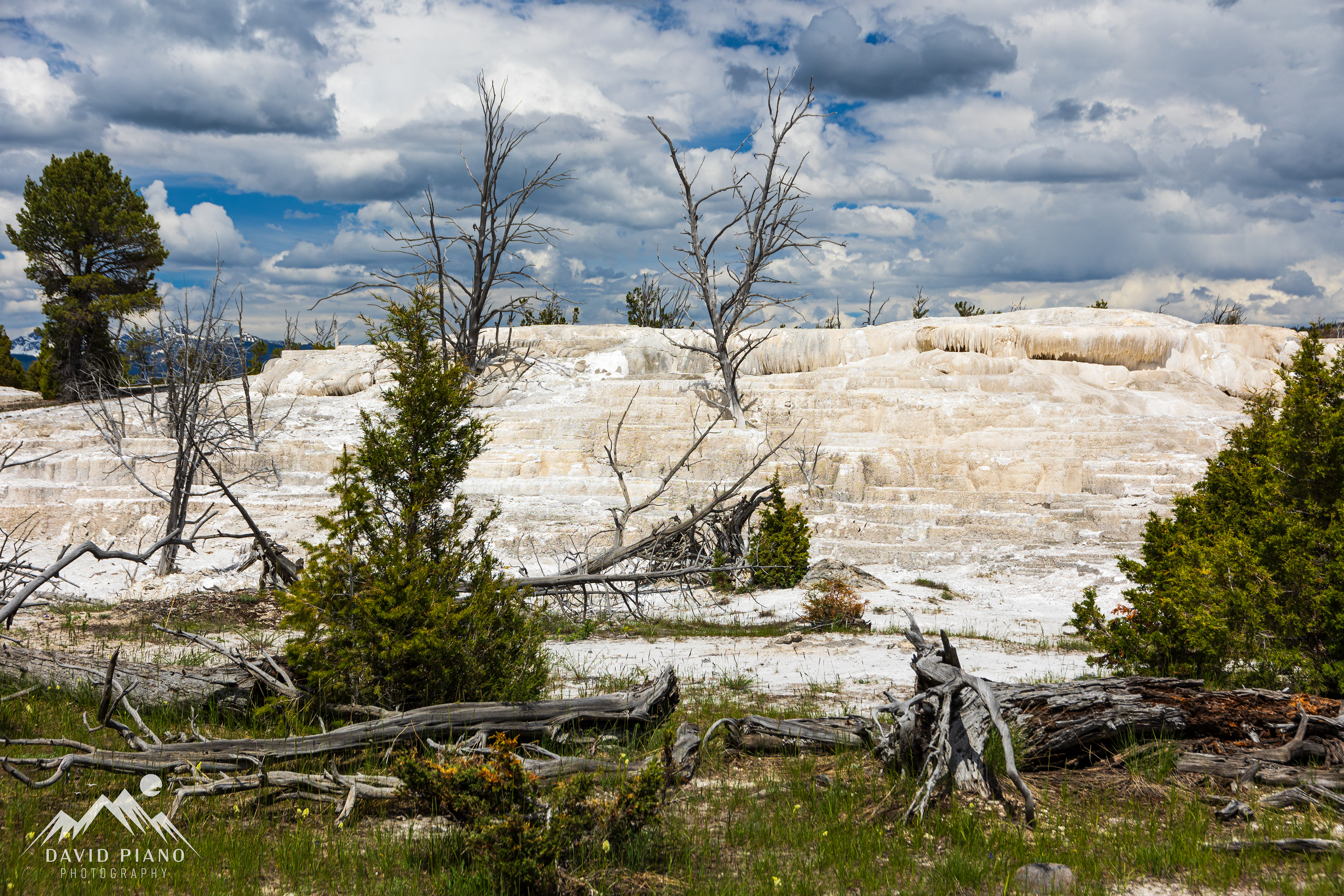 Pine tree growing from a mound of travertine deposits